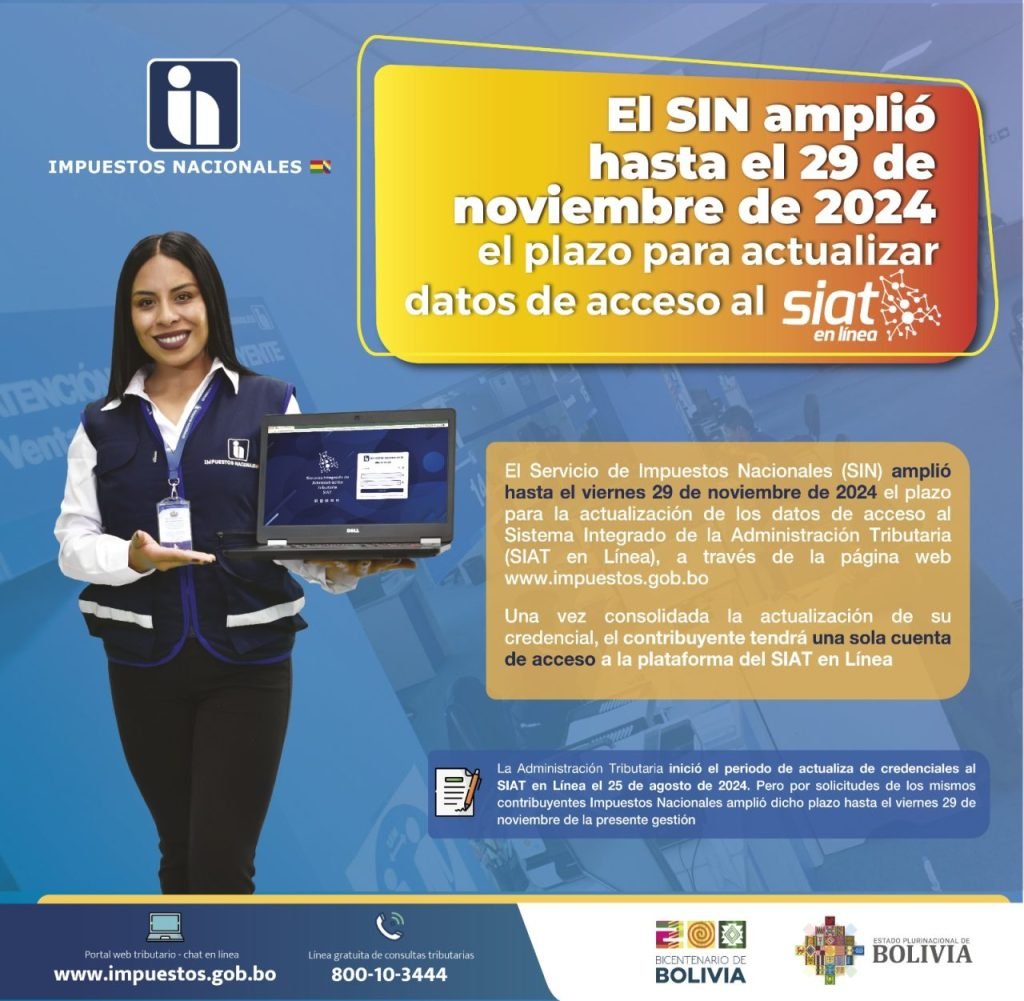A solicitud de los contribuyentes, el Servicio de Impuestos Nacionales (SIN) amplió hasta el viernes 29 de noviembre de 2024 el plazo para la actualización de los datos de acceso al Sistema Integrado de la Administración Tributaria (SIAT en Línea), a través de la página web www.impuestos.gob.bo, mediante la Oficina Virtual o el SIAT en Línea, registrando su correo electrónico y número de teléfono celular (el SIAT en Línea verificará la autenticidad de ambos datos).
