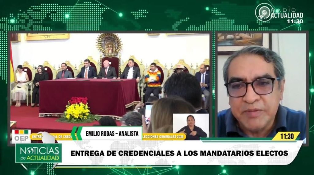 El analista político Emilio Rodas calificó el acto de entrega de credenciales al presidente electo Rodrigo Paz y al vicepresidente electo Edman Lara, realizado en la Casa de la Libertad de Sucre, como un evento de carácter protocolar y simbólico que marca el inicio formal de la transición democrática en Bolivia.