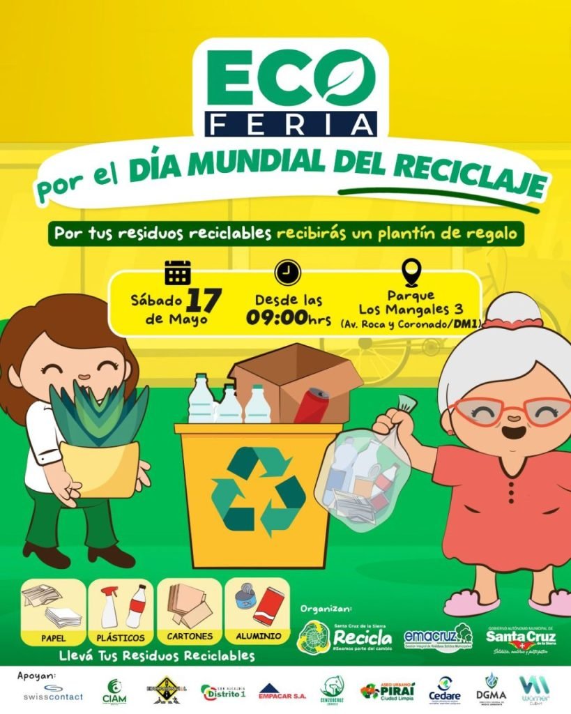 Este sábado 17 de mayo se realizará la EcoFeria del intercambio en conmemoración del Día Mundial del Reciclaje. El evento tendrá lugar en el Parque Los Mangales 3 (ubicado en la Av. Roca y Coronado y 3er anillo interno), desde las 9:00 a.m. a 12:00 p.m.