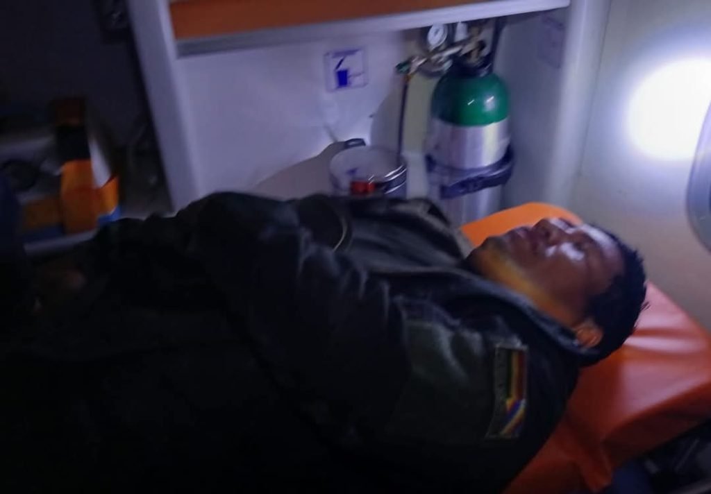 El uniformado cayó aproximadamente tres metros y fue auxiliado por sus camaradas, quienes lo trasladaron en ambulancia hasta la Caja Cordes del Hospital Obrero, ubicado en la avenida Blanco Galindo. Su diagnóstico es reservado.