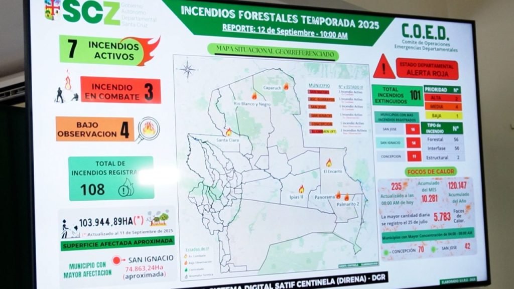 Actualmente, siete incendios activos se reportan en distintas zonas: tres en combate activo en San Matías, San José y Ascensión de Guarayos; y cuatro bajo vigilancia en Concepción, San Ignacio y Carmen Rivero Torrez.