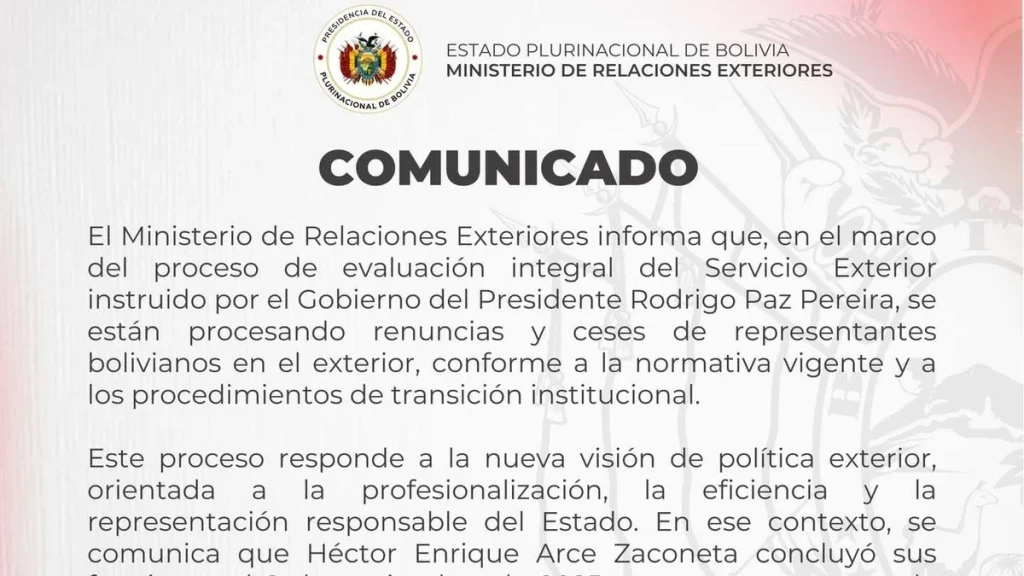 La cartera destacó que la revisión busca fortalecer la composición profesional del cuerpo diplomático y garantizar que la representación internacional del país se ejerza con responsabilidad y criterios técnicos. En ese marco, el ministerio confirmó que Héctor Enrique Arce Zaconeta concluyó sus funciones el 8 de noviembre de 2025 como delegado de Bolivia ante la Organización de los Estados Americanos (OEA).