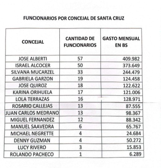El Concejo Municipal de Santa Cruz mantiene en planilla a 266 funcionarios asignados directamente por los concejales, lo que representa un gasto mensual cercano a dos millones de bolivianos, según denunció el presidente del ente deliberante, Juan Carlos Medrano.