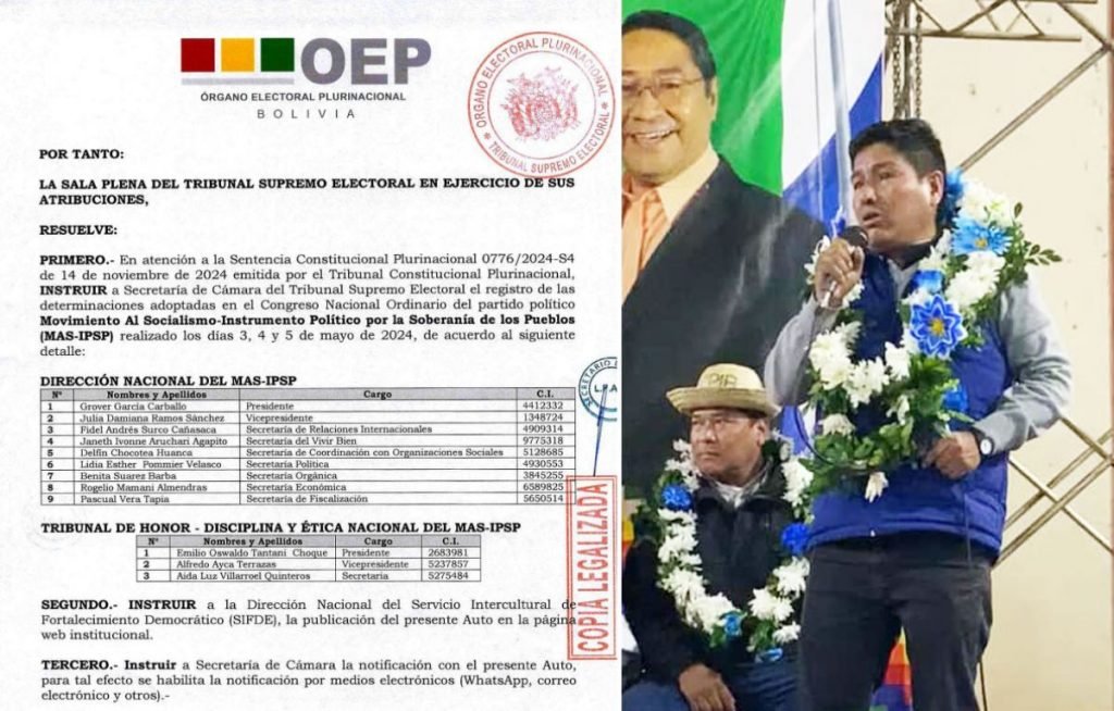 Mediante el Auto 022/2024, el Tribunal Supremo Electoral (TSE) reconoció a Grover García del ala “arcista” como presidente del MAS-IPSP, cargo que era ejercido por Evo Morales.