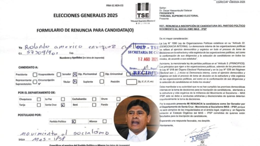 El diputado Rolando Enríquez Cuéllar, quien figuraba como candidato a tercer senador por Santa Cruz en representación del Movimiento Al Socialismo (MAS-IPSP), presentó este martes su renuncia oficial ante el Tribunal Supremo Electoral (TSE).