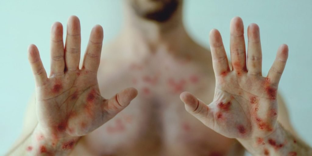 La enfermedad se manifiesta a través de ampollas que comienzan a aparecer en el rostro y se extienden hasta los pies, incluso a las palmas de las manos y los pies.