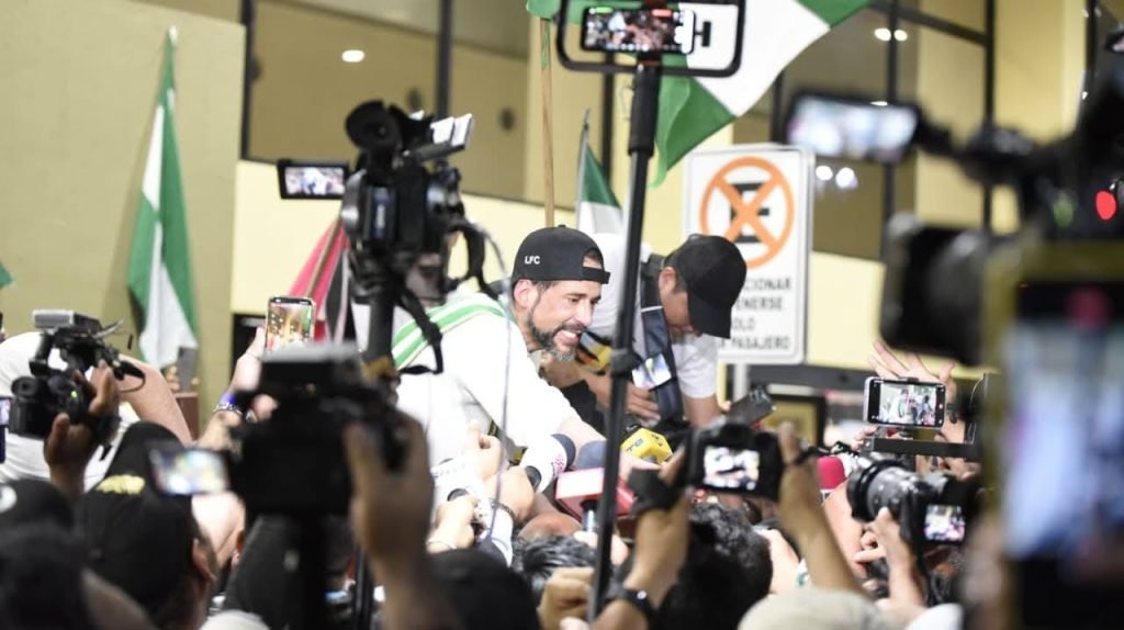 Fuera de la terminal aérea, una gran concentración ciudadana esperaba su salida, dando paso a una caravana que lo acompaña por por la zona norte El ambiente es de celebración, con banderas, música y expresiones de júbilo es lo que se puede observar a su paso.